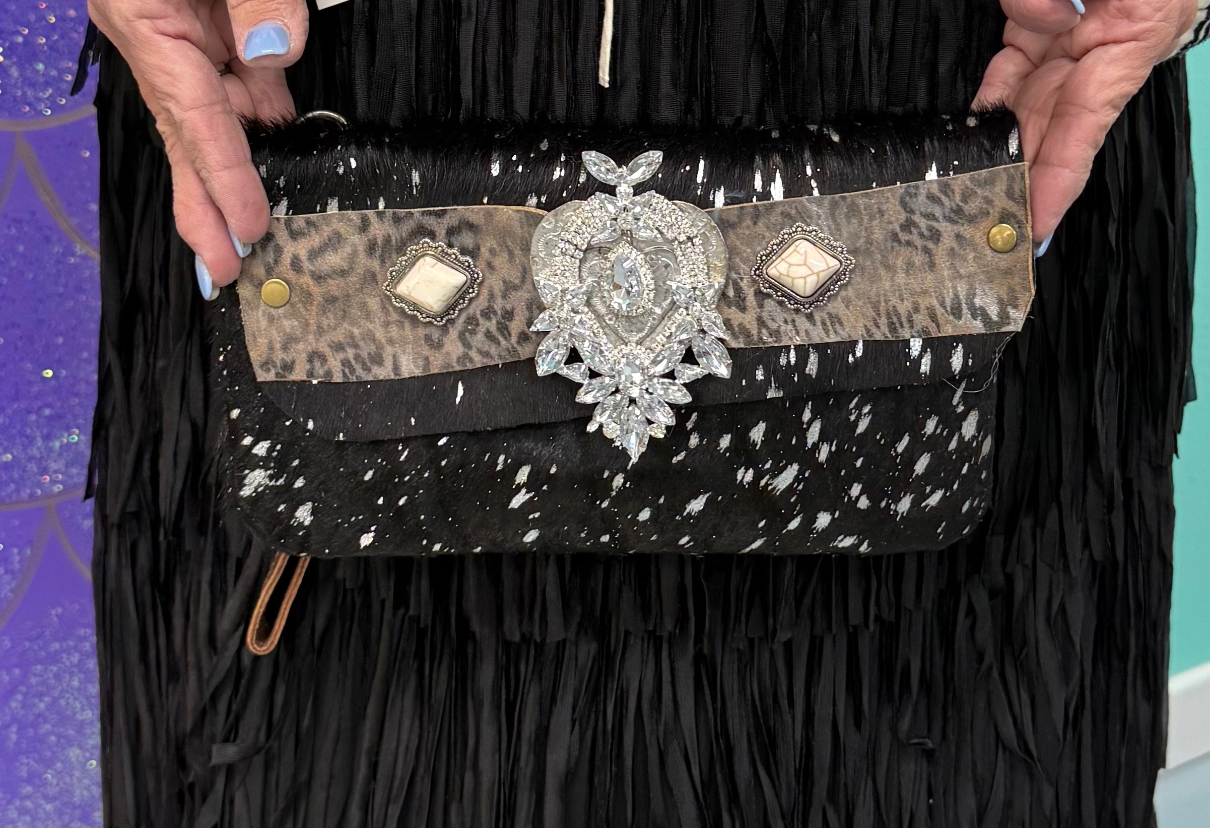 Introducing the Fancy Hair on Hide Clutch, your new go-to for turning heads (and maybe even some necks)! This one-of-a-kind wonder, with its genuine hair-on-hide leather and shiny crystal bling, is perfect for those moments when you want your accessories to do the talking. Sling it over your shoulder or clutch it close—you’ll be the talk of the town!