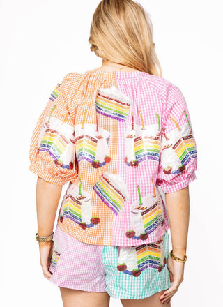 Queen Of Sparkles Color block Gingham Rainbow Birthday Cake Button Up Shorts
