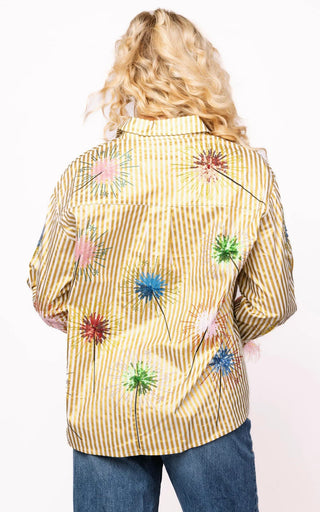 Queen of Sparkle Gold Stripe Multi Sparkler Button Up Top with Pink Feather Sleeves