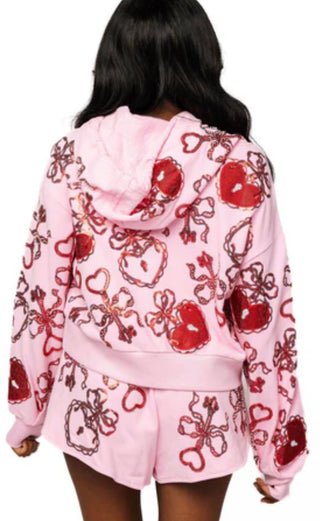 Queen of Sparkles Pink and Red Heart Lock and Key Tie Hoodie Sweatshirt