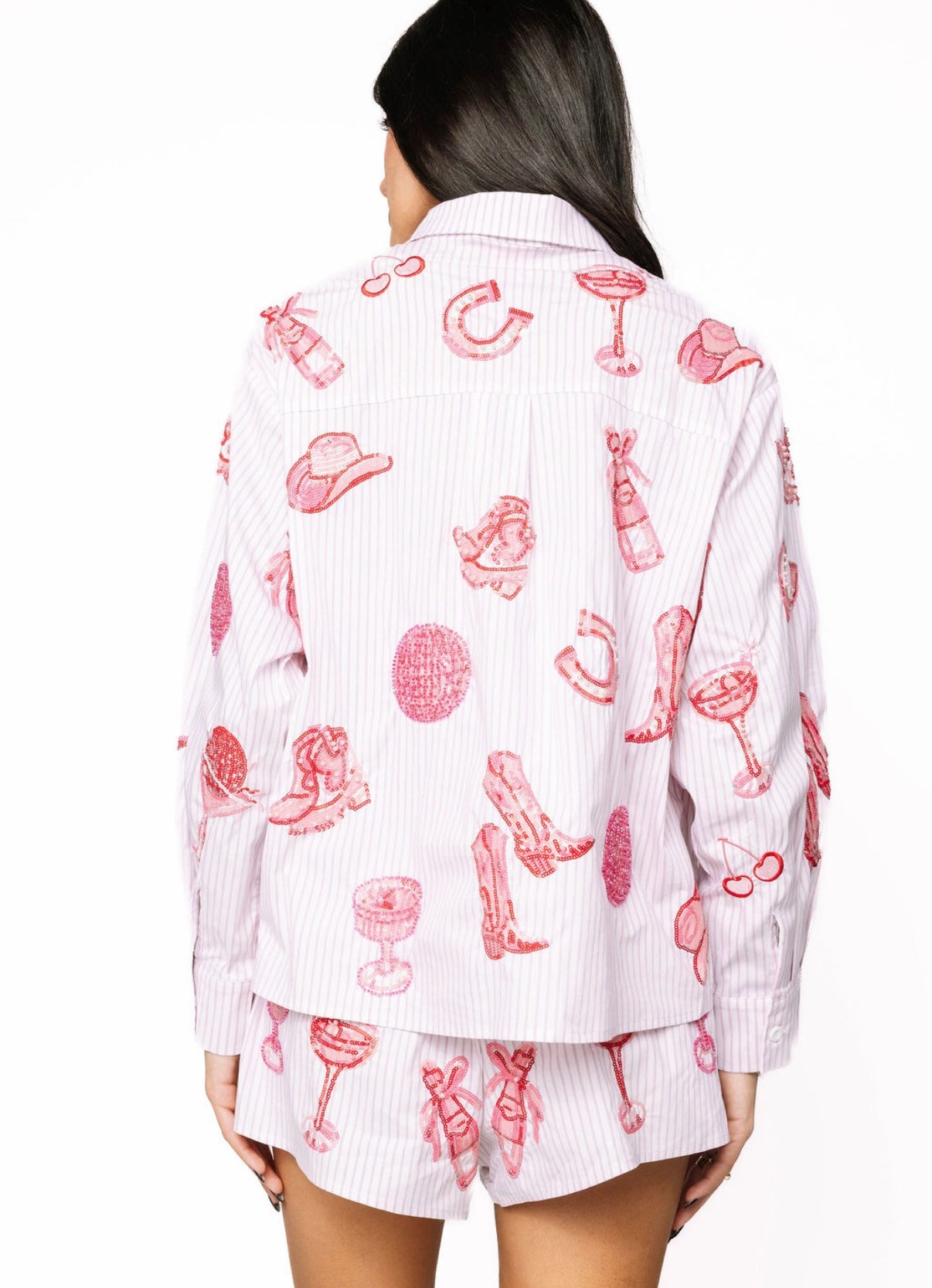 Saddle up for some serious sparkle with this pink disco cowgirl icon collared top! Featuring eye-catching sequin details and a fun Western-inspired vibe, it's the perfect statement piece for anyone ready to shine. Style it with the matching shorts for a coordinated look, or mix and match with your favorite separates—this versatile top works solo too. Whether you're hitting the dance floor or turning heads at your next event, you'll be the queen of the scene in this playful, glittery essential.