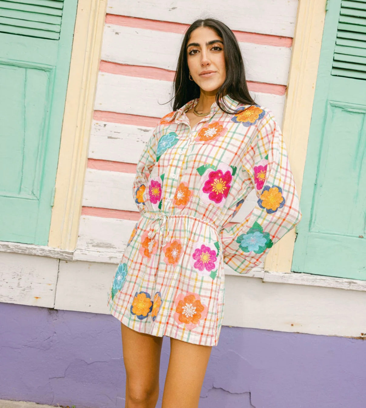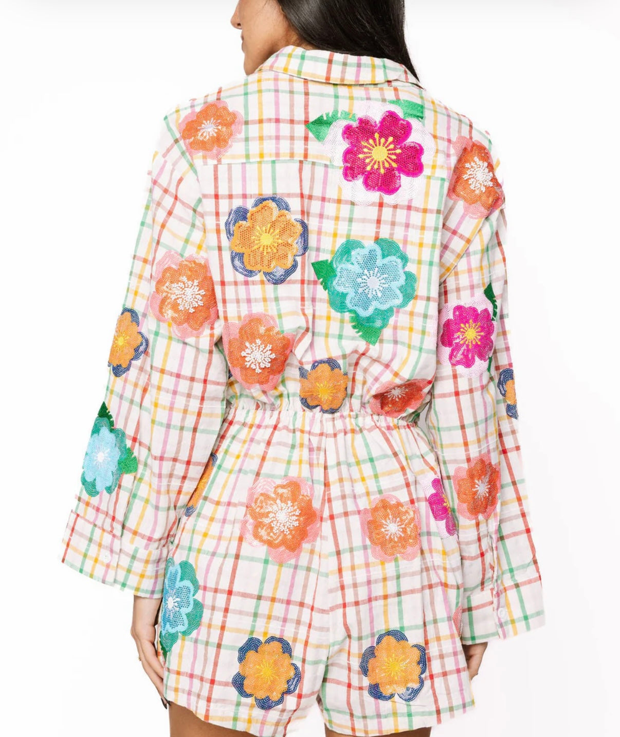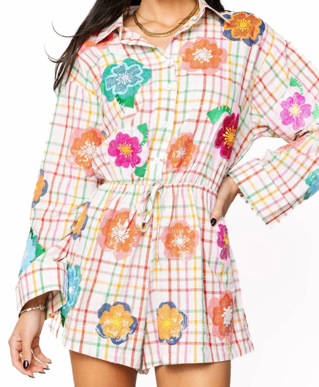 Twirl into the spotlight in this show-stopping romper that's basically a party on fabric! Featuring vibrant rainbow plaid mixed with delicate floating flowers, this cotton button-up is perfect for anyone who refuses to blend in. The comfortable fit and breathable cotton make it ideal for festivals, casual outings, or whenever you want to feel like royalty. With its playful color palette and charming details, you'll be the queen of any room you enter. Dress it up with heels or keep it casual with sneakers—either way, you're guaranteed to sparkle!