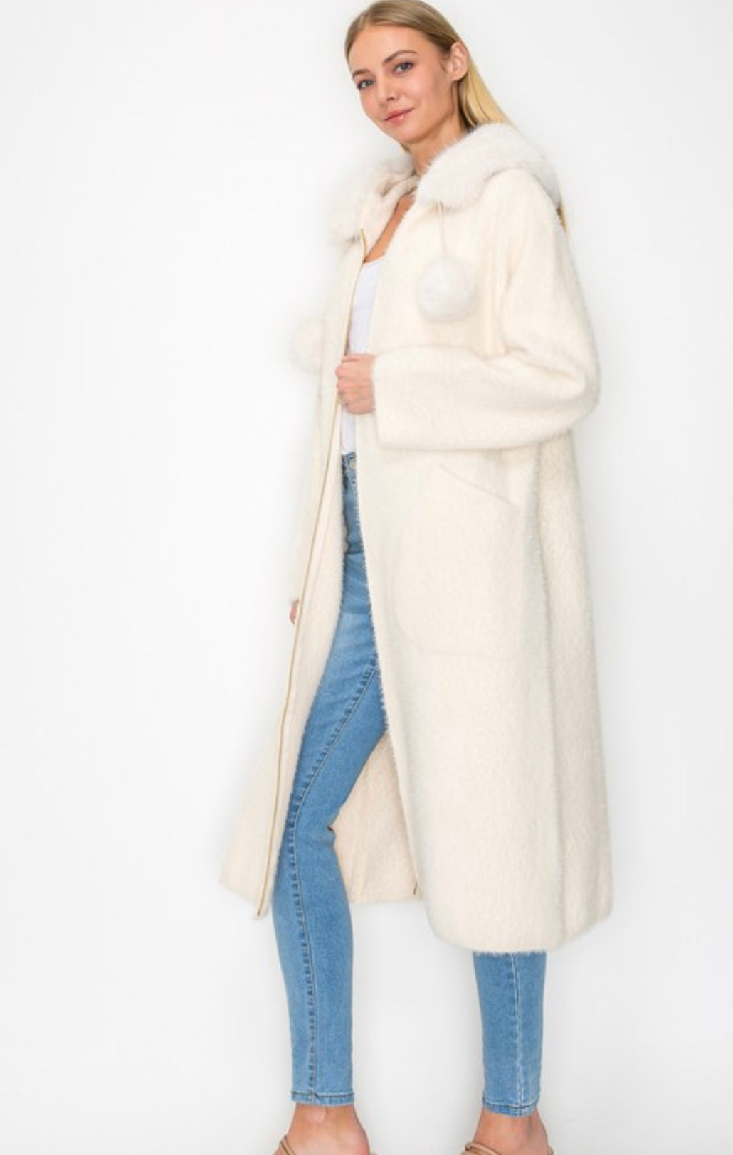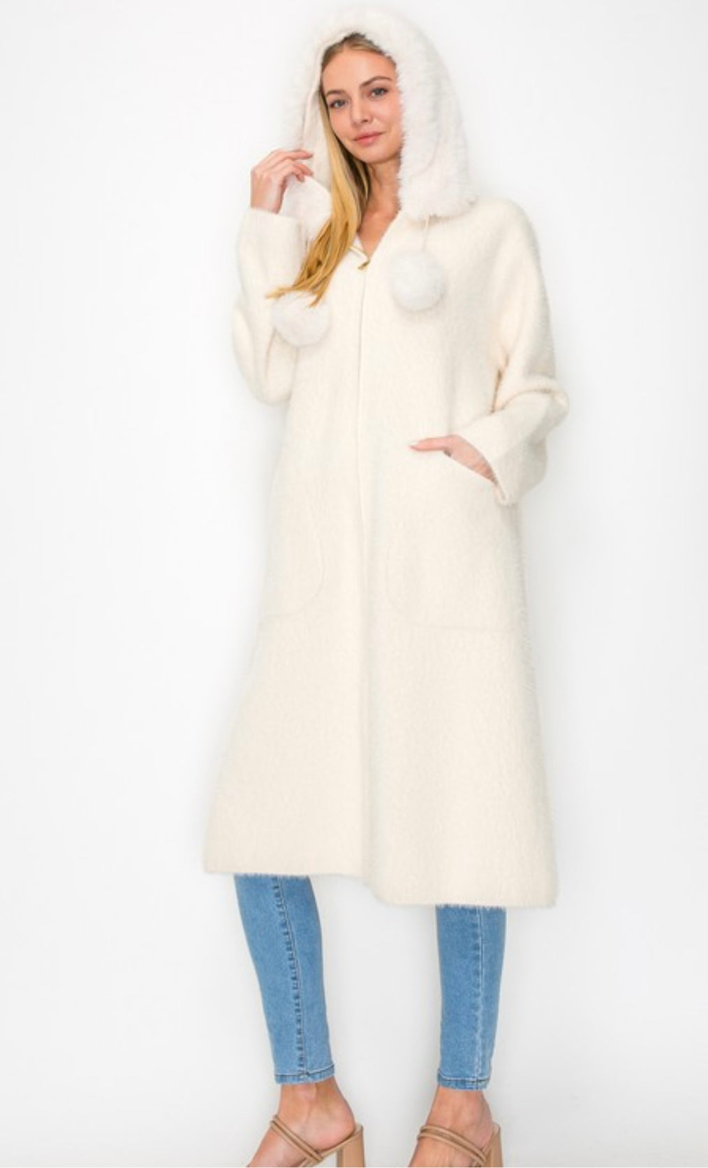 Get ready to turn heads with our Cream Suraya Knitted Brushed Coat! This winter white duster is not only soft and warm, but also lightweight- perfect for chilly days. Featuring a hoodie and fun feux fur poms, this coat is as stylish as it is cozy.