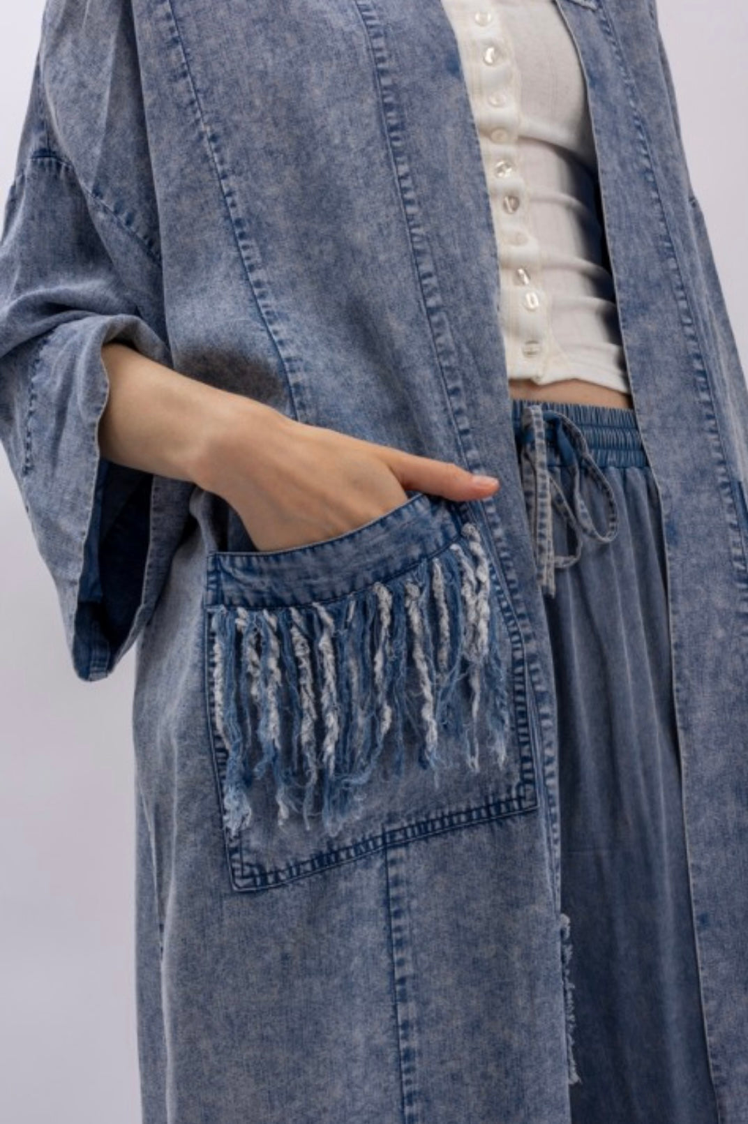 "Add some flair to your wardrobe with our Denim Duster! This lightweight and stylish duster features a star patch and fringe pocket details. Perfect for a trendy and playful look. (Fashionable, fun, and functional!)"