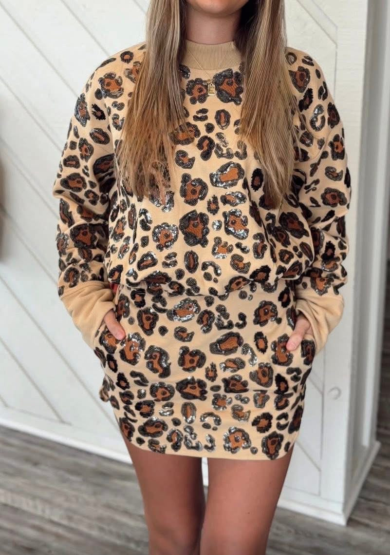 Unleash your wild side in our Leopard Mock Neck Queen of Sparkles Dress! Covered in sequins and featuring a fun leopard print, this dress is made of sweatshirt material for ultimate comfort.