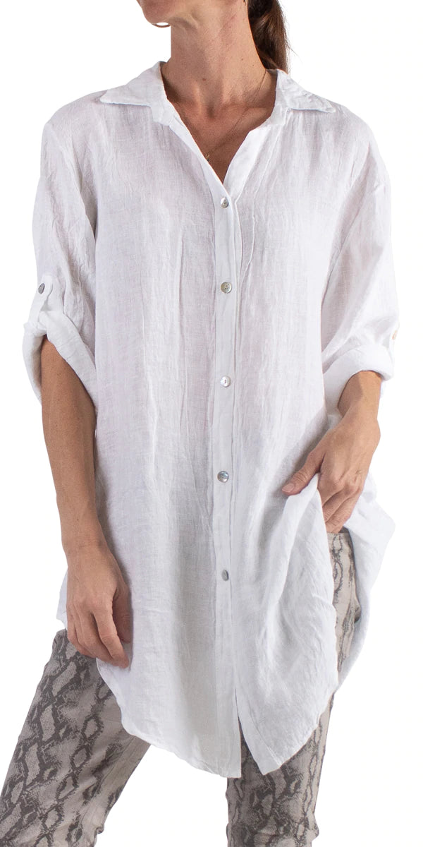 This versatile shirt can be dressed up or down.�� Button detail on sleeve.�� Wear it open with a tank or alone.�� One size fits up to a XL buttoned.