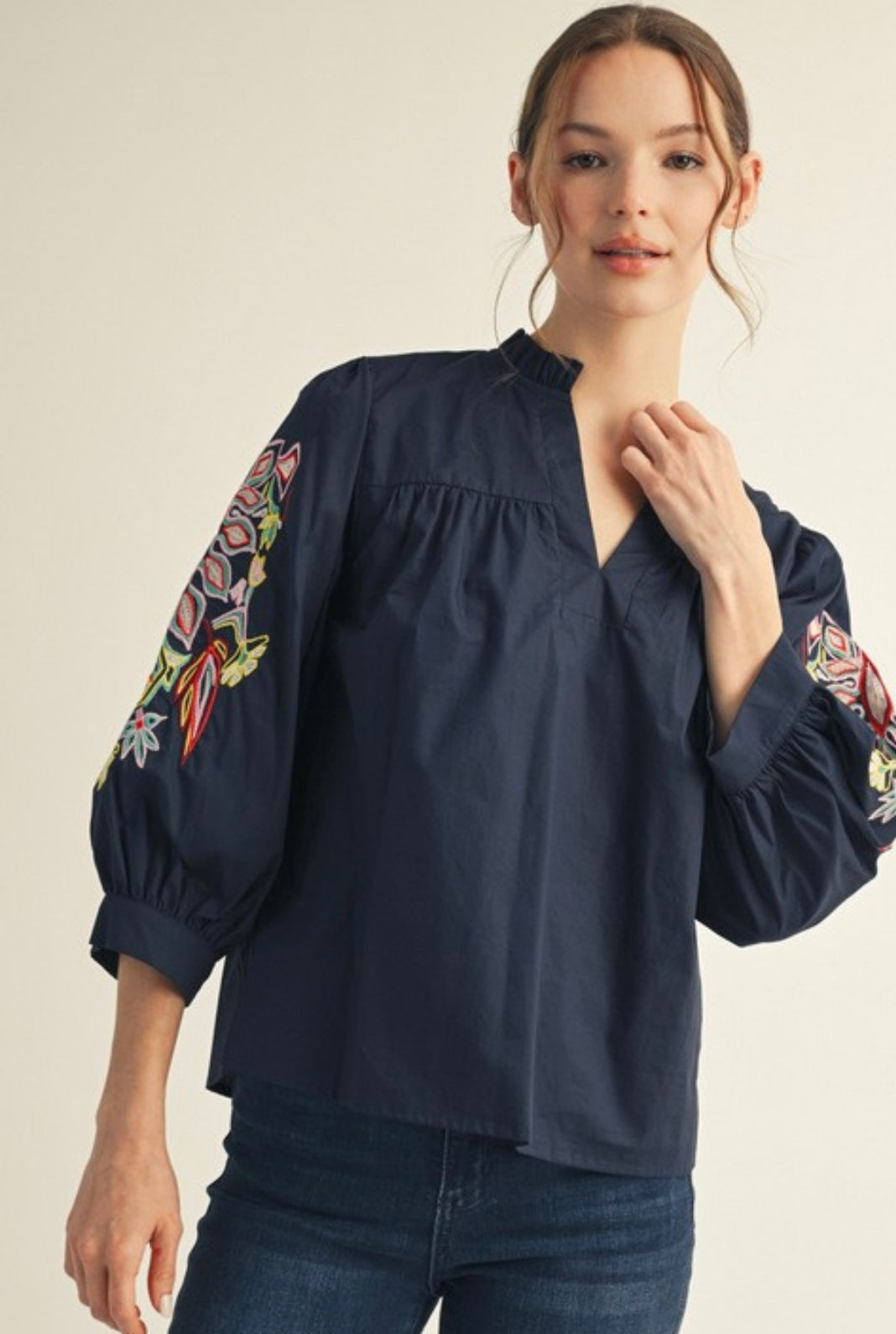 "Add a pop of color with our Navy Embroidered Puff Sleeve Top! Crafted from soft cotton, this top features playful puffed sleeves adorned with colorful embroidered details. Perfect for adding some fun to any outfit. Get ready for compliments!"