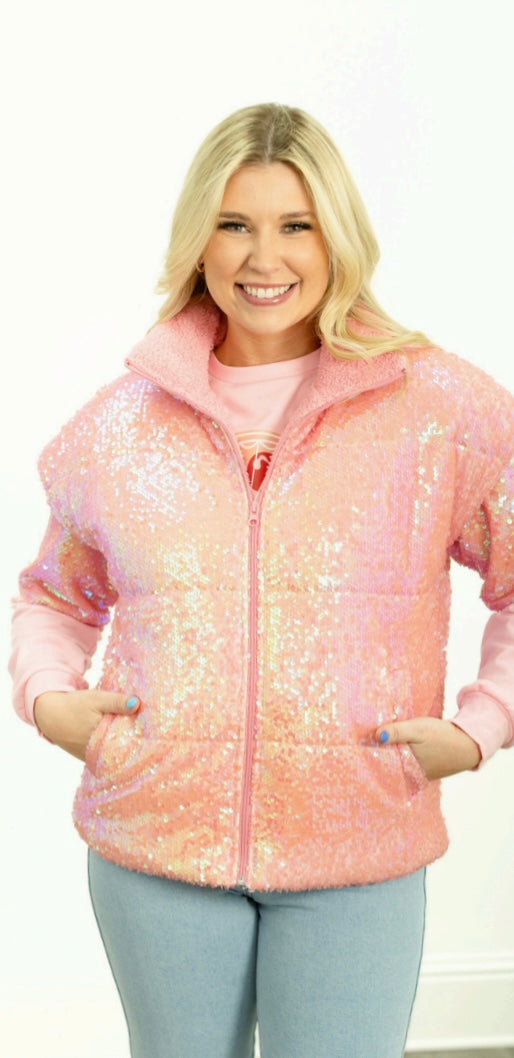 Sparkle and shine in our Pink Sequin Puffer Vest! Keep warm and trendy with this unique vest covered in eye-catching sequins. Perfect for adding a touch of glam to any outfit. (P.S. pairs well with sass and confidence)