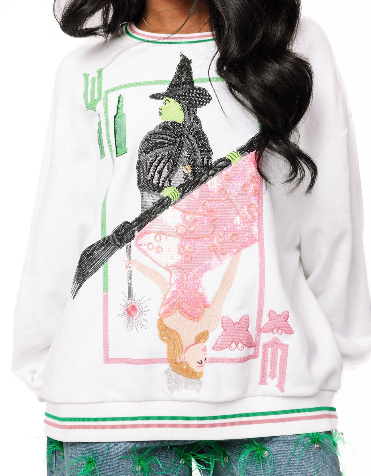 Celebrate your favorite witches with the Queen of Sparkles Elphaba and Glinda Card Sweatshirt! Featuring playful wicked silhouettes, this cozy sweatshirt blends magical charm with everyday comfort, perfect for adding a touch of sparkle to your casual look. Whether you're channeling good or bad vibes, this whimsical design keeps you stylishly spellbound all day long.